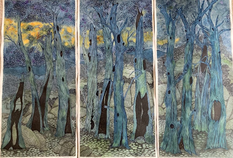 · Angus Cameron – A printmaker based in Avenel, Angus creates intricate impressions on paper that echo the forms and patterns of the natural world. His work reflects the micro and macro beauty of the Strathbogie Ranges.